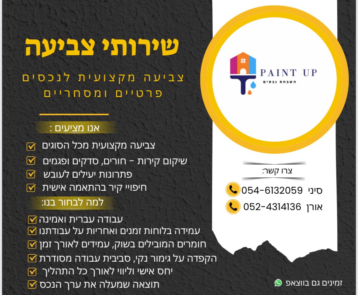 PAINT UP היא חברה מקצועית לעבודות צביעה ושיקום נכסים, עם התמחות בשיקום קירות, טיפול בעובש, חיפויי קיר וצביעה מכל הסוגים.